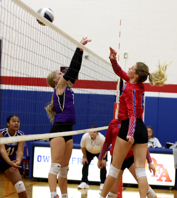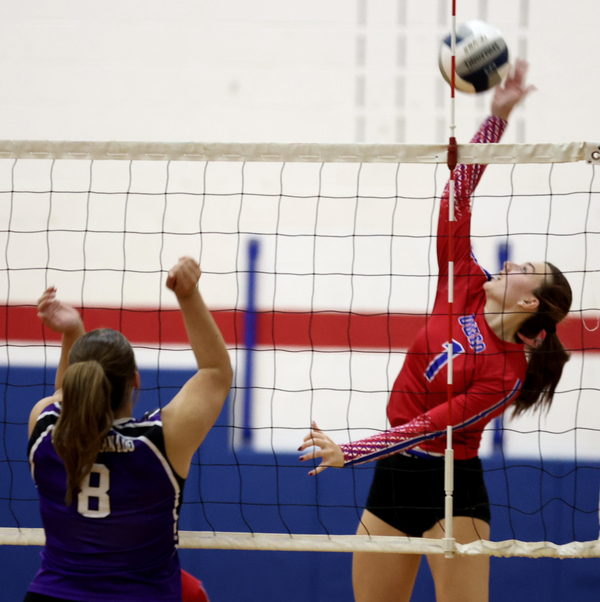 All-state standout Maggie Hamed recorded a double-double with 14 kills and 10 digs, and she also received some help at the net from some of her teammates, including sophomore Ava McKeon, who seemed to be a distraction to Norwich at the middle of the net.
