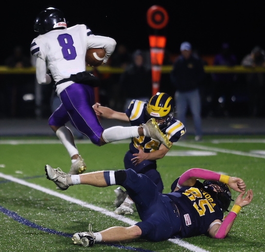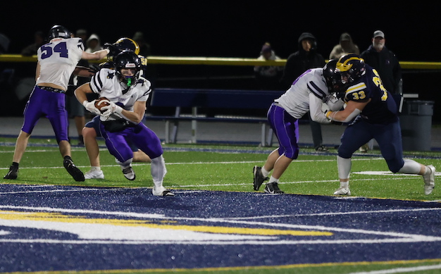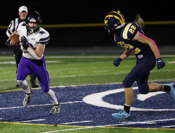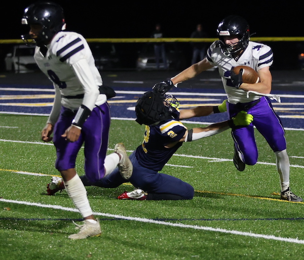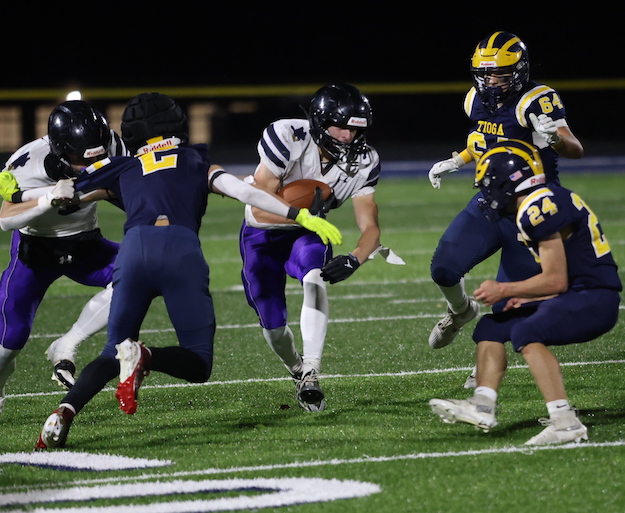 Four plays later, Cole intercepted Jakobe Foster at the Tioga 27 on the final play of the quarter, then Dominic Palmer bolted up the middle for a 36-yard TD run on the second play of the final stanza. Bombard’s PAT run made it 36-7 just 53 seconds into the quarter.