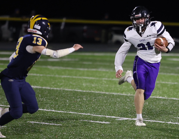 Aman finished with 103 yards on 20 carries for SVEC (6-3, 3-2 division).Foster had 31 on six rushes, Charlie Hilbert added 26 on seven runs, Owen Beach had one carry for 23 yards, and Landon Lawrence and Landon Whitmarsh tacked on one 6-yard run each.