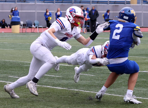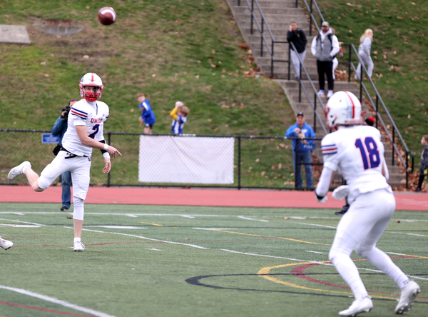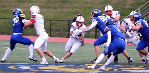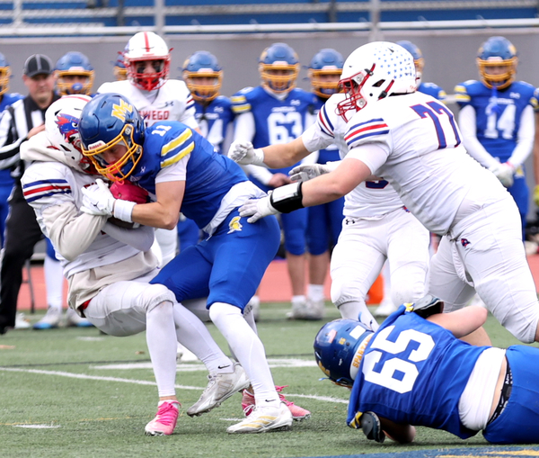 Oecker completed 14 of his 21 passes for 187 yards with Konrad grabbing seven passes for 117. M-E ran for 147 yards as Smallacombe carried the ball 16 times for 67 yards and Konrad had nine rushes for 35 yards