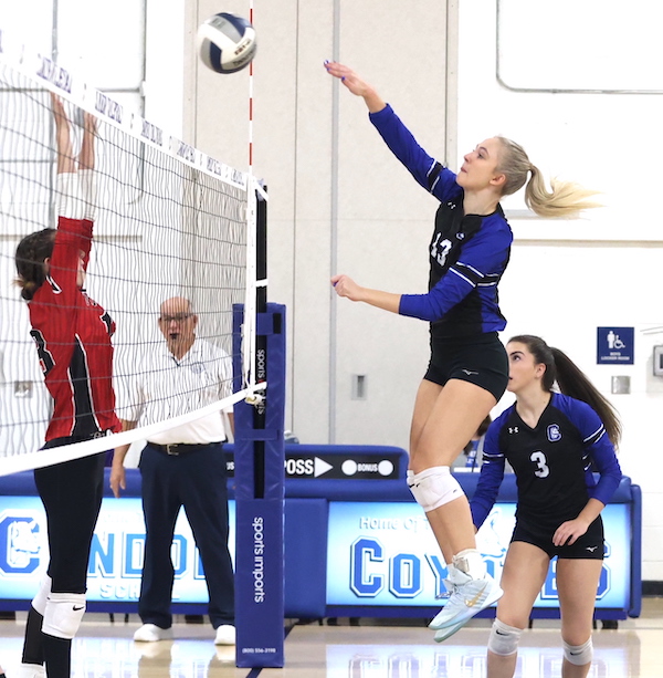 The Coyotes led 10-7 when senior Jill Teribury served up five straight points, including a pair of aces and a kill by Makie, to stretch the advantage to 15-7.