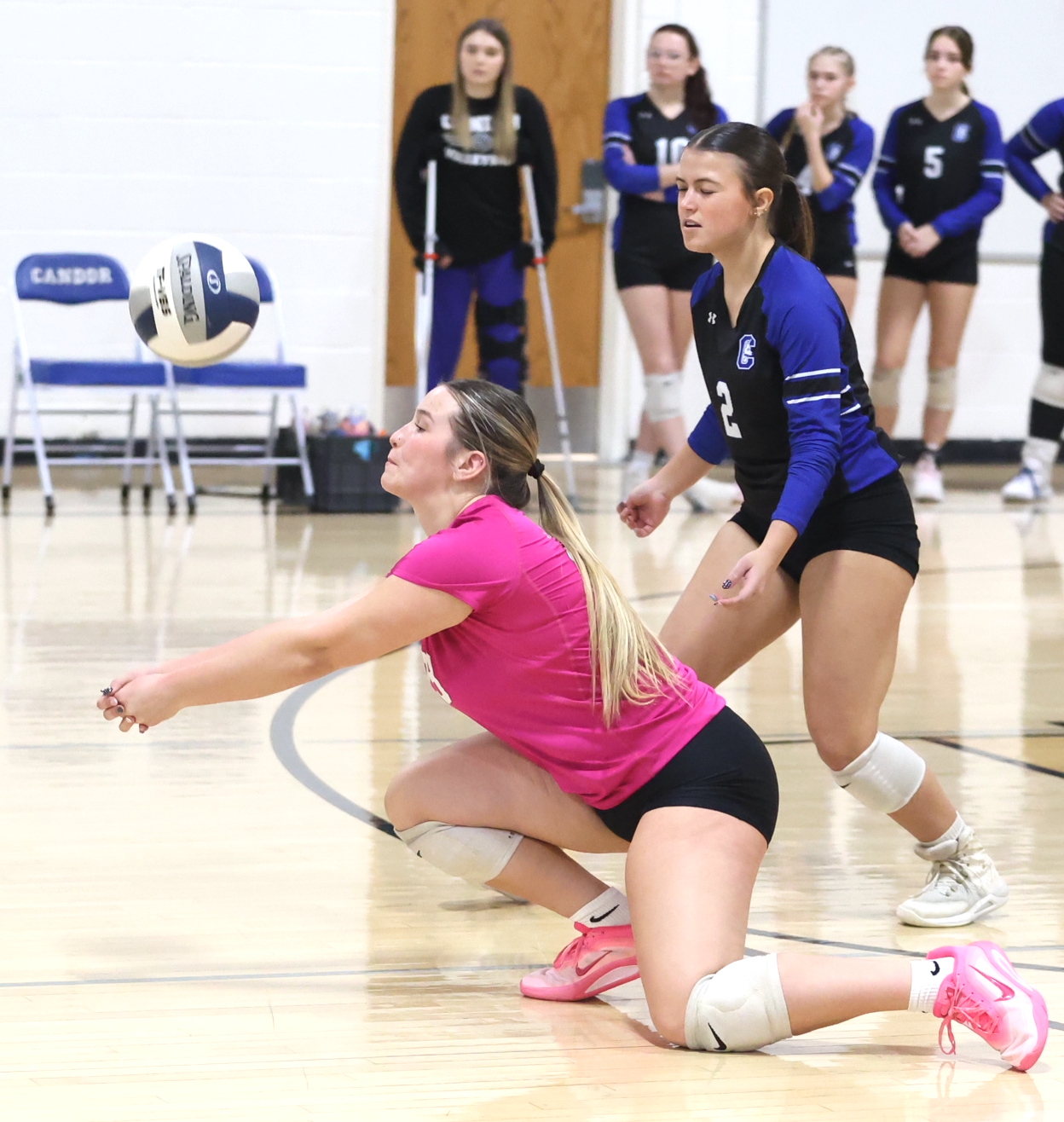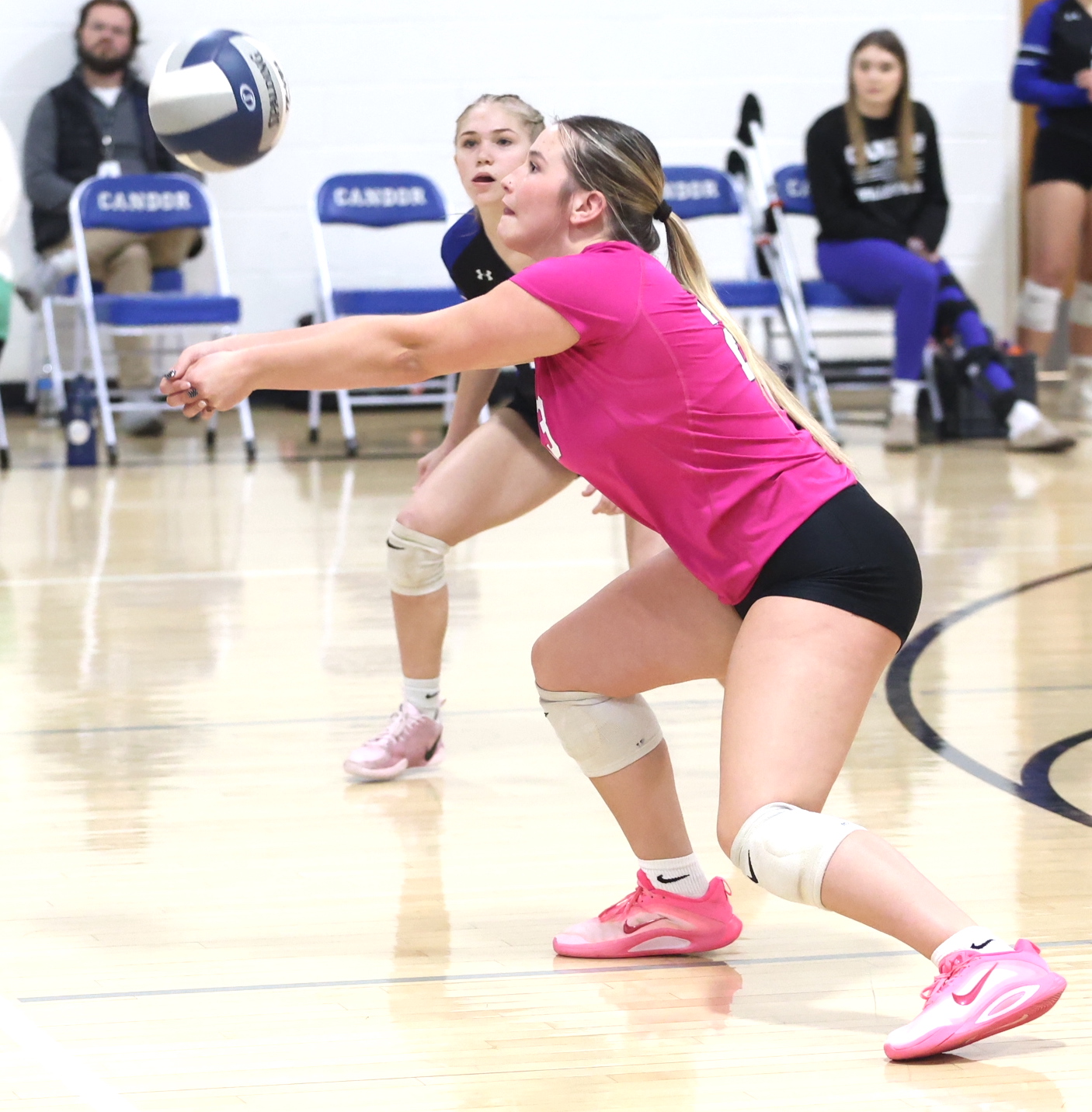 In the first set, Candor steadily pulled away, with a four-point service run, including three straight aces, by senior Tracy Reynolds making it 19-6.