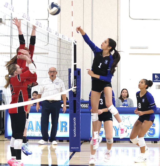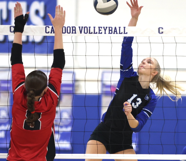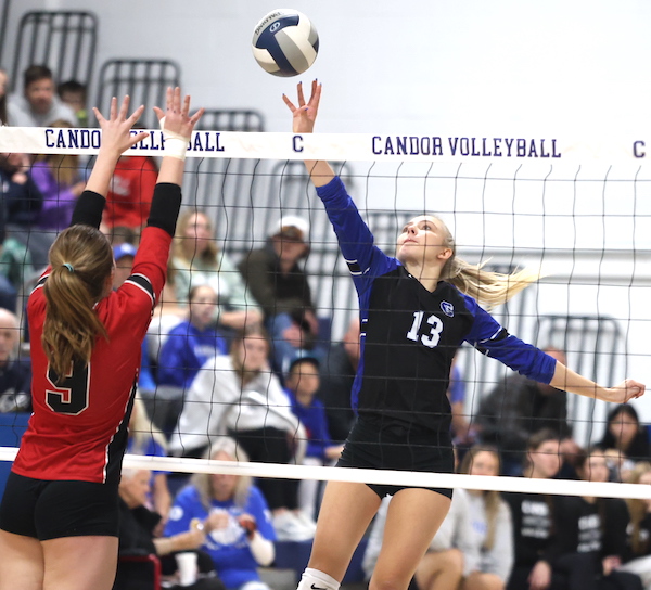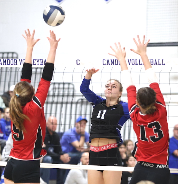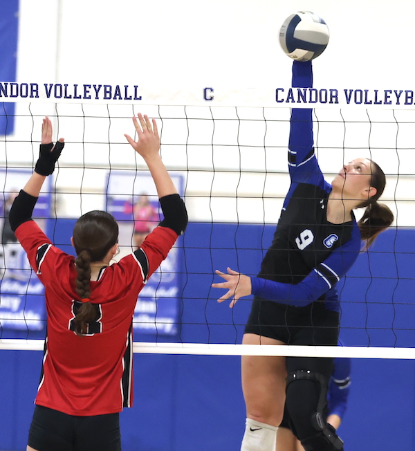 The Coyotes jumped out to big leads early in each of the first two sets, thanks to service runs by senior Nicola Soper — five points, including four consecutive aces, in the first set to give Candor a 9-2 lead — and junior Malley Heidl — four points in the second set to make it 7-2.