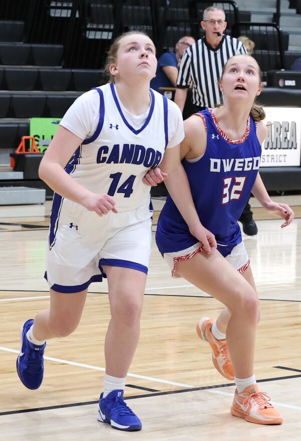 Jenna McEvoy knocked down a pair of treys and scored eight points while Makie had five for Candor in a back-and-forth battle for the first six minutes of the first quarter with Owego coming out ahead, 11-8.