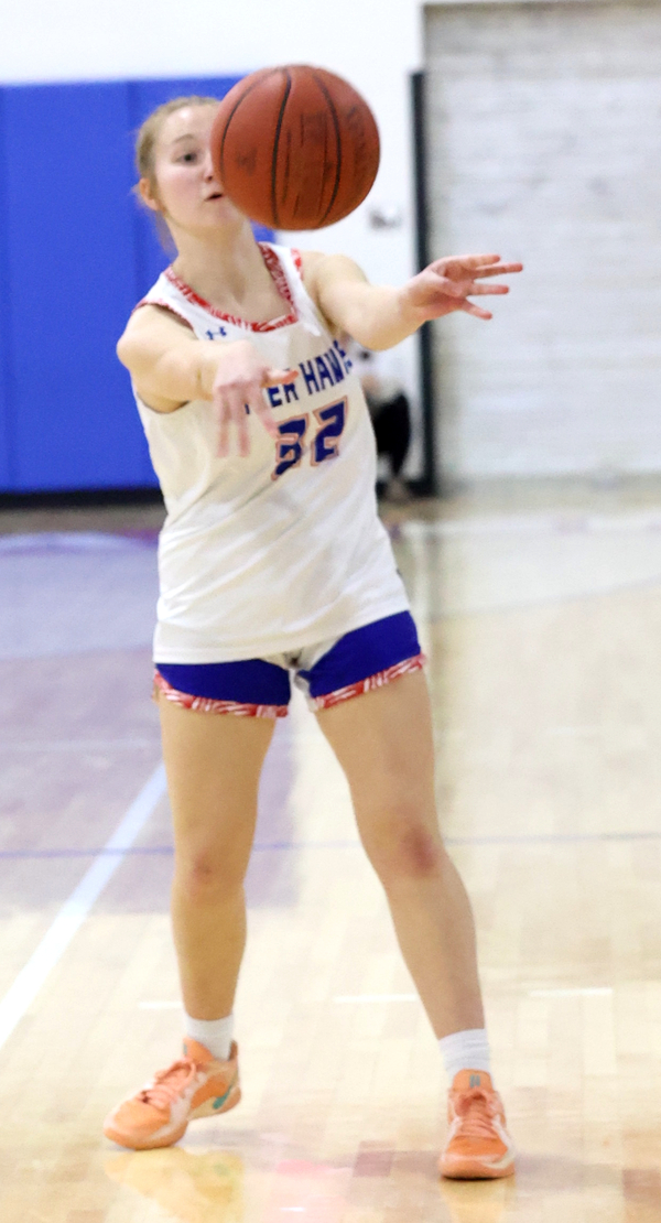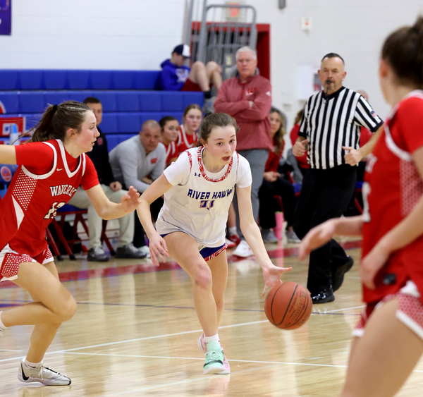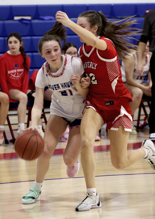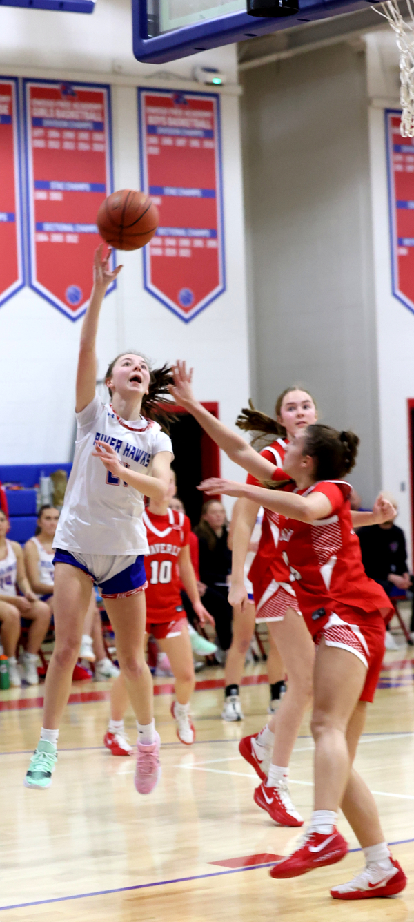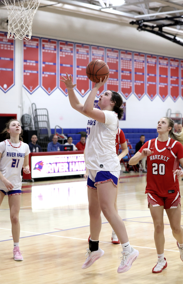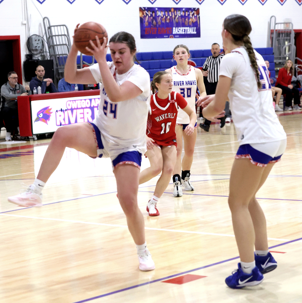 The River Hawks’ Marielle Searles exchanged baskets with Kaylin Twedt. Owego’s Jenna McEvoy pushed the lead to 35-33 on a pair of free throws with 2:06 on the clock.