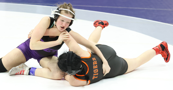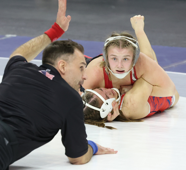 Groton’s Remington Marshall took Beach down to her back twice in the first period, building an 8-0 advantage. One more takedown would do it, but this time Beach was ready. She took Marshall down and scored the pin at 2:04.